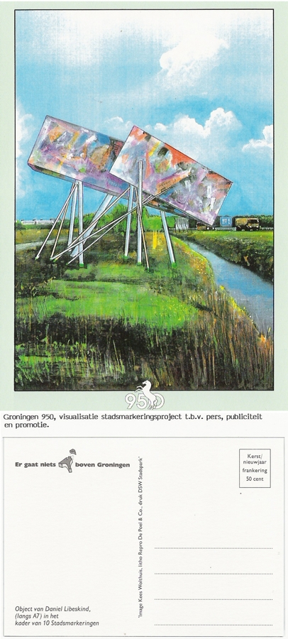 1990 Gemeente Groningen/Project Stadsmarkering, visualisering van de 10 stadsmarkeringsobjecten t.b.v. pers en publiciteit/presentatie (o.a. set kleuransichtkaarten)